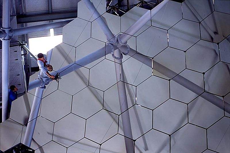800px-Salt_mirrorMany research telescopes have lenses made up of multiple mirrors. Each individual mirror must be pointed in exactly the right direction to focus the light they gather into a clear picture. By using many smaller mirrors, telescope lenses can be made much more economically and much larger than is possible with a single, large lens. The only drawback is that if one of the mirrors is a little off – pointing just slightly in the wrong direction – the image created has distortions and the whole thing is rendered useless until the wayward mirror is re-positioned properly. The mirrors each sit on their own little platform with its own little motor which can swivel it around to get it into just the right position. When all the mirrors are positioned just right, the result is a detailed, crisp image of objects around the universe which are unimaginably far away.